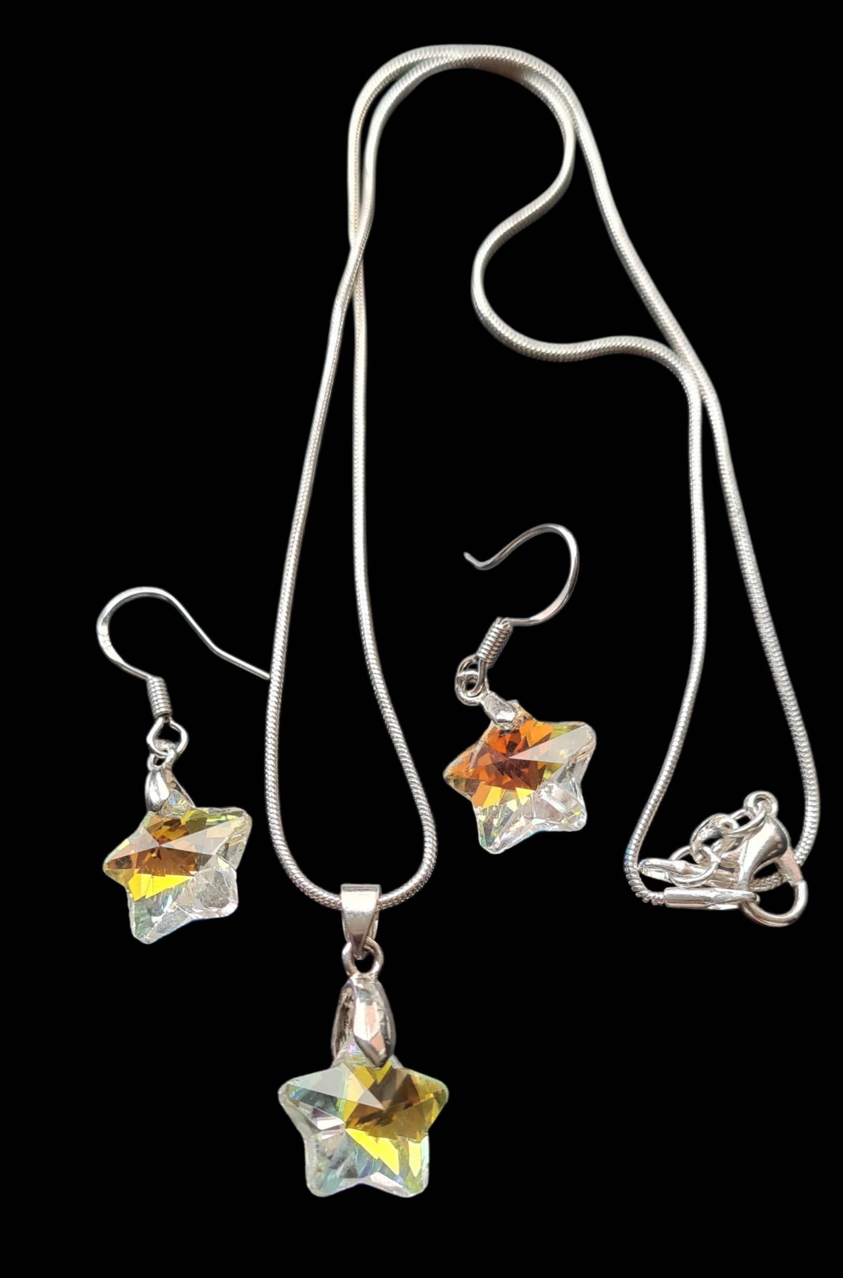 Deze prachtige sieradenset met Swarovski Elements in de vorm van een ster is een echte eyecatcher voor iedere sieradenliefhebber. De set bestaat uit een elegante ketting met stervormige hanger, vervaardigd van hoogwaardig 925 sterling zilver. Door het gebruik van Swarovski Elements krijgt de hanger een schitterende glans die het licht op een unieke manier weerkaatst.