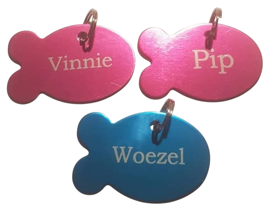 Zoek je een unieke en veilige kattenpenning? Deze visvormige kattenpenning van metaal is perfect voor katten die graag op avontuur gaan. De penning wordt laser gegraveerd met naam en contactgegevens en is verkrijgbaar in meerdere kleuren. Dankzij het lichte gewicht draagt je kat hem comfortabel. Ideaal als katten naamplaatje aan de halsband, met tekst aan voor- en achterkant mogelijk.