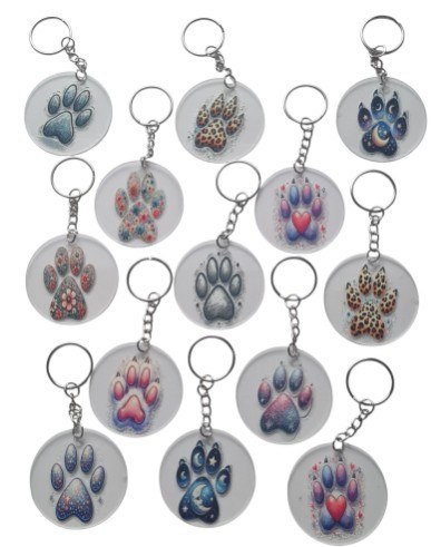 De ronde sleutelhanger is gemaakt van stevig, doorzichtig acryl en bevat een gekleurde pootafdruk van een hond of kat, verkrijgbaar in verschillende uitvoeringen.