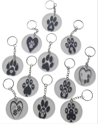 Deze stijlvolle Sleutelhanger Pootafdruk Zwart/Wit is gemaakt van duurzaam acryl en heeft een moderne zwart/wit honden- of kattenpootafdruk. Met een diameter van 5 cm is hij ideaal voor je sleutelbos, tas of rugzak. Lichtgewicht, helder en krasbestendig. Verkrijgbaar in diverse uitvoeringen. Perfect voor elke dierenliefhebber of als persoonlijk cadeautje.